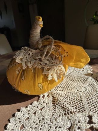 Wow! That was fast.. got a pm.. and yes, I made pumpkin, I used a orangey colored bandanna, some twine rope, some bits from a tattered doily. I stuffed the bandanna, brought up the sides, took the edges, wrapped the twine around it, leaving one of the corners hanging out like a leaf. No sewing involved.  .