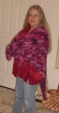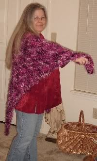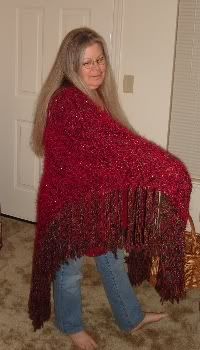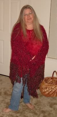 Lookie what I got from Bonne!!!!!! Look how well the red one matches this top. It's a super fairy shawl! Thank you sooooo much. I love it..with the fringe it is almost to the floor  It's midnight and I'm just checking the mail this week...I've been in digital hell all week taking pictures of this fabric..LOL I felt like running around the pond with the fringe waving behind me but figured one of the neighbors would see me and call the cops saying a crazy woman is on the loose.