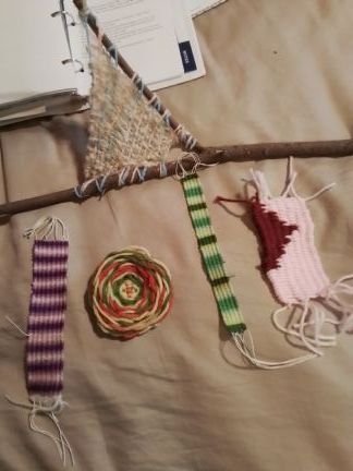 This turned out fun. It is very time-consuming but rewarding when you see the outcome. I made a coaster a couple book marks and just a square piece as well as weaving on a stick."