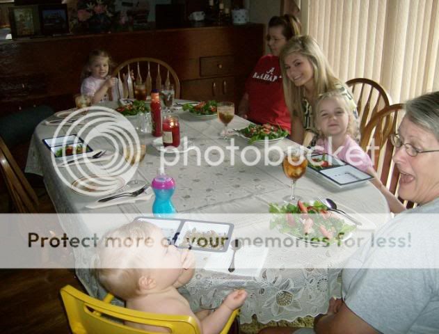 My Aunt Tootie is in the Alabama t-shirt with La seated next to her then my sister Sharon's eldest, Callie Grace. Lunch was spinach salad with strawberries, walnuts, and rasberry vinagerette, chicken casserole with sweet peas, mushrooms, and rice, followed by peach cobbler. To drink was either Flower garden/jasmine tea or rasberry tea. Yum!!
