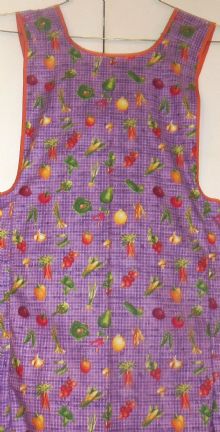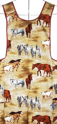 Each Apron made with 100% cotton fabric, 2 pockets one on each side. The sides come around behind with apron strings to tie in the back. The straps comfortably fit on the shoulders not on the neck, you forget you have it on. Side seams are surged, trimmed with bias tape.
