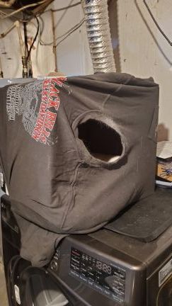 My cat, Karl Catnip, spends a lot of time in the basement. I wanted to make him a little hideaway and saw this on Facebook (who knew?). I found a largish box, put in soft bedding, pulled one of my husband's unwanted 2x shirts over it, and voila! Karl climbs through the neck and cuddles inside. It's on the dryer so that the dogs don't pester him. My husband was ready to buy a teepee shaped hideaway,but I convinced him to give this cheap alternative a try.