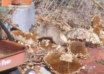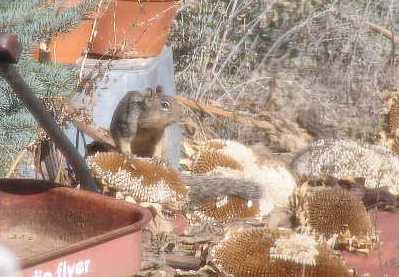 Thought I'd share pics of our little sunflower seed thief. I had harvested my sunflowers and laid the heads by our spruce tree in the sun to dry. As you can see, this little creature is packing the seeds away. Fun to watch!!! Thanks for looking!! CJ