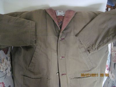 This is an old faded lived in well worn barn coat I fell in love with at a thrift store and haven't had the farm to wear it much. It's back to the Goodwill unless someone loves barn coats and would like to barter something small for it. It's olive green with a leather lower collar neckline, says size 2, but would translate into a 14/16 I believe. Anyone need an old barn coat to actually wear to the barn?