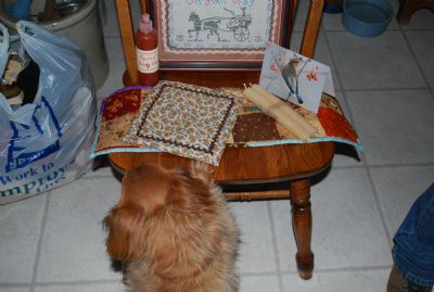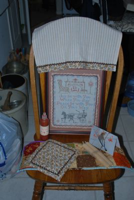 Julie was the farm girl who got the CROCS, so our barter was she would send me a Farm Girl Surprise Package as that is what I love the most. Well, as you can see from the picture she sent me far more than she received. She knew I collected Vintage Samplers and she had one that she had bought awhile back but it did not fit in her home. She was going to get rid of it but thought she should hang on to it for some reason. So, now it is in my home and I can not wait to add it too my collection. I have about 20 samplers hanging in the hall way that leads to my guest room, not the one from Julie will hang there as well. I love it, it is beautiful. I also got some candles, body wash, dish towel, pot holder, and a runner, and I will bet Julie made them all. Thank you so much Julie, and I hope we can barter again:-)Oh yes, my Dachshund Heidi liked my treasures as well.