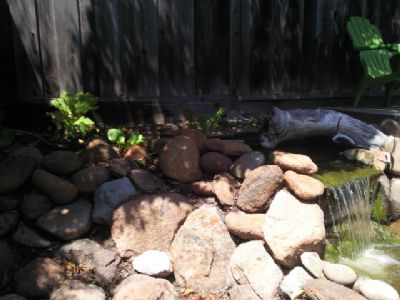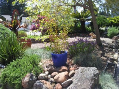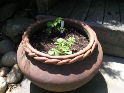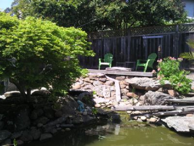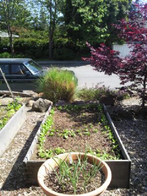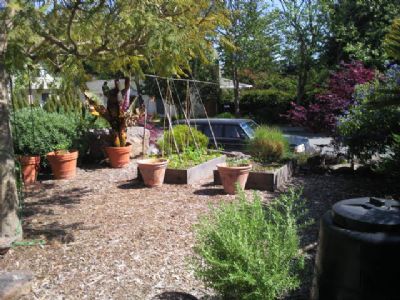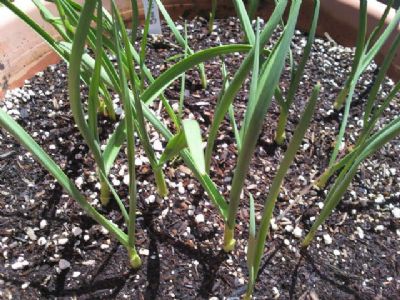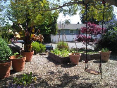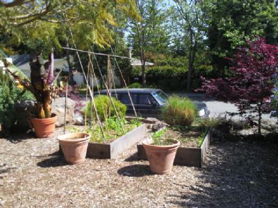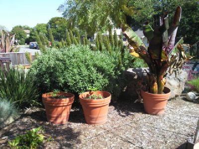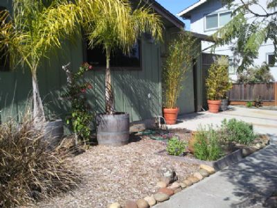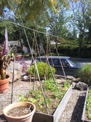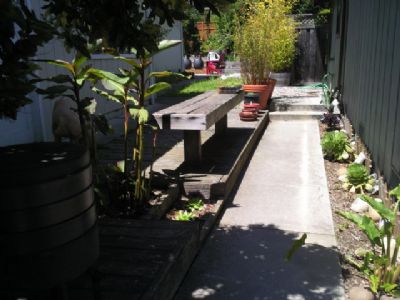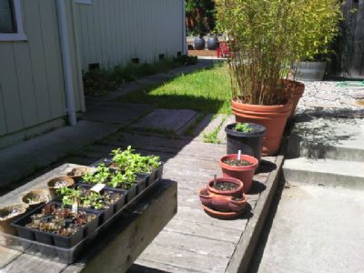 Hi Kristin! Rain actually sounds good today. It is 75 here in Santa Cruz. That is a heat wave for us here by the coast! The 2nd picture is garlic. This is the first year I am growing garlic and potatoes in pots. I am not sure how they will do in the pots, but it is fun watching them grow. The table thing in the 7th picture is a bench on the shared deck between my side yard and my neighbors. Enjoy the rain today!
