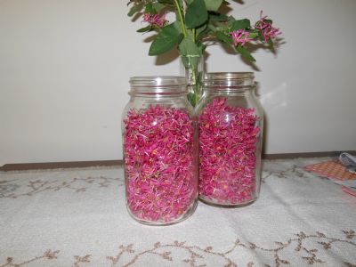 Have any of you made this? Just finished my last batch of violet and dandelion. DH was in our backwoods looking for mushrooms. He found instead some beautiful dark pink (rose to red color) honeysuckle! Yippee! We went back out and picked a couple of quarts of flowers. So, I looked on internet for a recipe for honeysuckle jelly and found several. Guess what we are making tomorrow. (no rest for the wicked. lol)