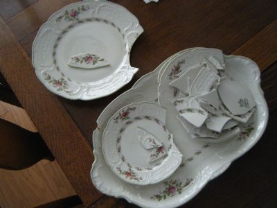 My mother had given me her lovely Rosenthal dishes almost 10 years ago,,,, and I am heart broken that this is what I found in the carton,,, after the movers had long gone...  Thank goodness the rest of the set is ok... Mom purchased them back in 1966, and these dishes have moved 3 times in Germany, and then to the States, and clear across the US.... I only lost one teacup on the move up to Spokane... but was not so fortunate on the move from Spokane, WA to California...  I am really disappointed in the moving company... on many levels! After I settle up with the insurance... I think I will save and use the broken bits in a mosic of some sort.