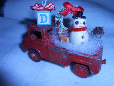 Okay, here is my creation, just made it. It is not much but this is why I want the old pick up trucks. This is an old Tootsie Toy Pick Up Truck from 1969. I saw these at the Country Living Fair in Stone Mountain GA last month, and I just knew I had to make some, they are just so cute, I think. Getting red and green ones for Christmas would be great.