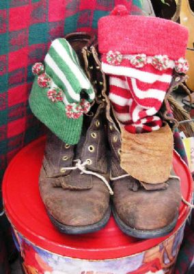 I found those boots at a thrift store for $1.00 . . .just like that. I love them because they tell a story of someone who wore them and worked hard! I'll never change them. They are too big for me but I use them to decorate my house and they go on EVERY Glamper adventure my daughter and I go on. They socks are warm and cozy but they are wool and a bit scratchy! CJ
