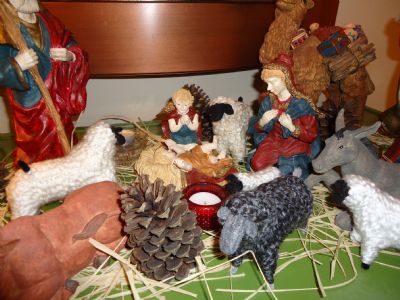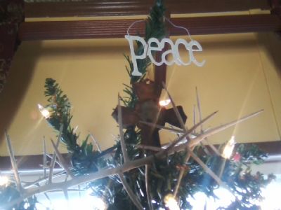 Well, I got as far as the tree for decorating, too many things have come up. When unpacking tree decorations, our tree topper (a star) ended up falling apart. A friend gave it to us several years ago. I looked around and used a Crown of Thorns that same friend made me and placed that on the top of the tree with an ornament that says "Peace" and a Cross ornament. I have to say that I like it better :)