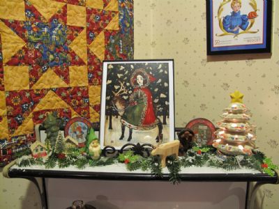 This summer, we had the opportunity to visit Finland and Norway. In Finland, we saw reindeer herds grazing in the Laplands above the Arctic Circle and met the indigenous Sami people who are their caregivers. To honor that visit, I ordered a print of a scandinavian girl riding a reindeer to set the stage for my winter scene on my little antique stove in the kitchen. There is also a small carved reindeer from the Sami people that I purchased at the Sami museum in northern Finland.