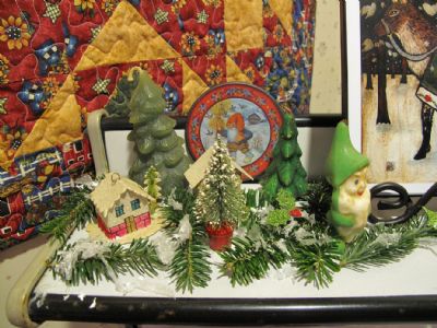 The next photo, shows a village with an old candle that was given to me at the classroom Christmas party in fifth grade in 1961. The Norwegian folklore do not have a santa figure. Instead, they have Nissen or trolls who lived on farms and were there to watch over livestock and the well being of the farm. They were , however, capable of mischief and destruction so families always left them a nice bowl of hot porridge on Christmas Eve to appease them. You can see the nissen on the coasters behind the little village and the wooden carved troll on the larger photo beside the ceramic tree.