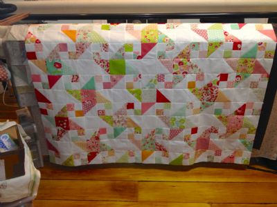 Scrumptious by Bonnie & Camille - such a lovely line. I have it at the shoppe. Camille designed a lovely pattern to go with that line that is somewhat simple to construct called Surfside. It uses layer cakes but I found the 10" squares to be to small for her cutting requirements. Camille's instructions are easy to follow and the quilt construction is fairly simple, consisting of rows of squares, 4 patch and half square triangles. It makes a lap/twin size quilt. Here is a picture of the top.