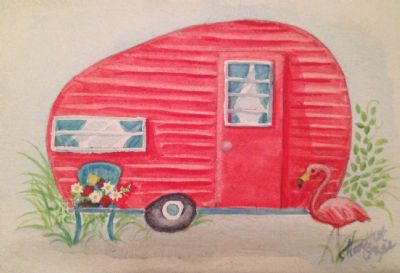 Cute picture. I have a rubber stamp similar to this. We have a big camper, but hope to down size so I can pull it and take it out myself. I would like a little one to decorate. I dream about what style I would use and actually collect items from the 50s in case I really do get to do a camper. I love the vintage turquoise with black and white. BUT, I like the true red and white combo. Who knows, but sure fun to dream.
