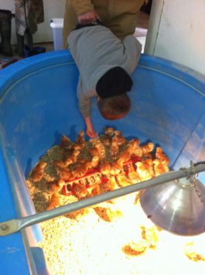 What a great photo! Looks like he's being held up by his pants LOL!! How many chicks did you get? Looks like they're doing well. I have 5 hens for eggs. Hopefully this summer I'll get some chicks for meat.