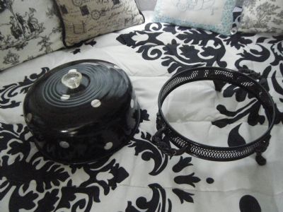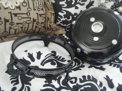 Good grief, I will spray paint just about anything that is not moving!  Here is what I did with an old tin cake cover, complete with clear plastic handle, and a silverplate casserole dish holder...
