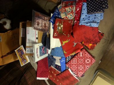 Thank you to some amazing ladies, Mz Darlene, Mz Maurrie, Mz Trish, Mz Rebecca and Mz Christa. You each has sent some wonderful fabrics to be sewn into the Quilt of Valor for the Vietnam Vet that lives here on the ranch. Just look at all this wonderful fabric!! Thank you so very much. I am about to start the half square triangles for this scrappy quilt.