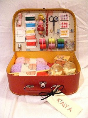 I think the one pictured is a cardboard suitcase for dolls and children. I have converted an old train case into my sewing catch all. It doesn't have all those elastic places to hold threads but I can just grab it and go as I leave the house. The side pockets hold my scissors and threads and thimbles and pin box. The item I am sewing is in the center (large) compartment. Go to PINTEREST and browse all the cool ways to organize your train case/boxes with handles, etc.