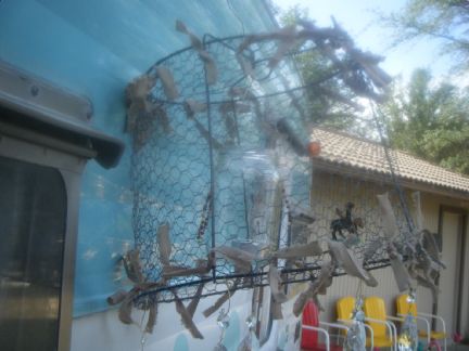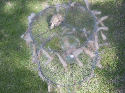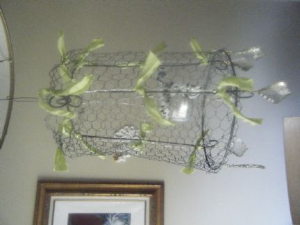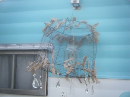 The one I saw had a gazillion crystles on it... so I used what I had on hand and then added torn ribbon. I used a 'tomato cage, cut it, attached small chicken wire and decorated and added a jar to hold the tes light candle... I am happy with the results. Fiddles, the dangly crystles are not showing in the photo very well..