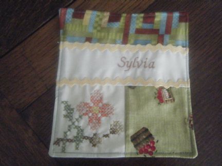 I used bits of scrap fabric, and I used wool felt for in between the top and bottom layer of fabric... The little cross stitched flowers are from a salvaged damaged linen... and I used my embroidery machine to stitch on the recipiants name... So or should I say, sew easy... Now to go make one for me... oh and one for my mommy...