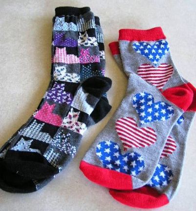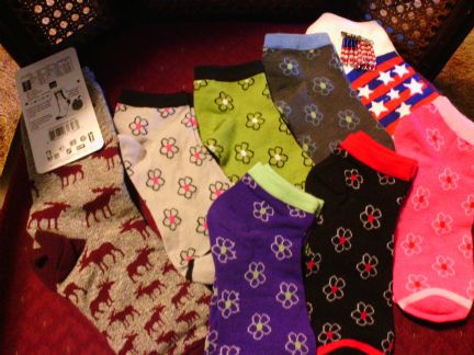 Igot my socks today, oh so many 8 pairs to be exact, I love it and a beautiful flag pin made with safety pins, so nice. 1 pair of the socks were covered with moose, I love moose alot, Thank you Shannon, the others were ankle socks of purple, pink, dark blue, tan, a green/ and brown and they all have dark strip at the top and are covered with little foot prints. The eighth pair is a pair of ankle socks with red and blue stripes on white, very pretty, Thanks so much Shannon.