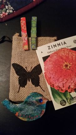 Look at this Adorable little Blue-bird of Happiness I got from Mary Jo Winter. And the cute clothes pins, sweet Butterfly Burlap Pouch and the Zinnias Look like a pkg of flower seeds but it was a greeting card. What a perfect little up-lift that was in my Mail Box Today. I just want you to know that I currently have my Front Foyer Decorated in Birds, Birdcages,Birdhouses and Nests. So, I put the little bird magnet out there on my Memo-Board. It fit is so perfectly with my display. Once it comes in the house it will go on my Fridge. THANKS SO MUCH...ENJOYED IT ALL!!