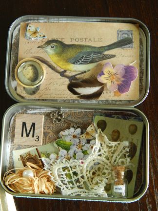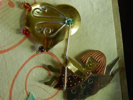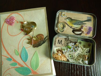 My mail art came yesterday, and I love it!! This is the first mail I've received from a fellow farmgirl and it did not disappoint! Diana sent me this beautiful tin she made! I'm definitely going to find a special place to keep it. She also sent me a card with a pin on it. The pin comes off and you can wear it. It's a girl swinging from a heart, and she really swings! So cute. Thanks Diana!!