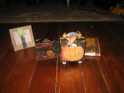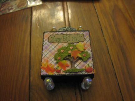 And thank you for the wonderful tucks. The Pumpkin Candle smells amazing and I just had time to peruse the M.E. Autumn Book before I headed out to teach my Bible Study Group tonight. I will sit down with a cup of tea or coffee tomorrow and read through it. I also loved your card and note. Thank You So Very Much for a Great Swap...yours will go out Saturday. Every- thing is dry. If anything pops off...just hot-glue it back on. Yours only lost one kernel of pop-corn and a foot on the bottom. All fixable!!