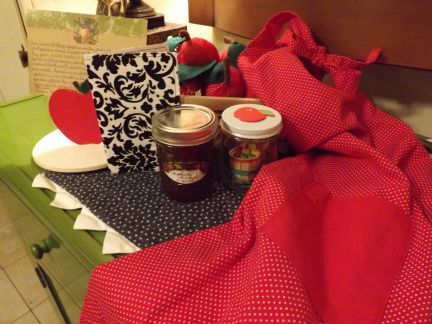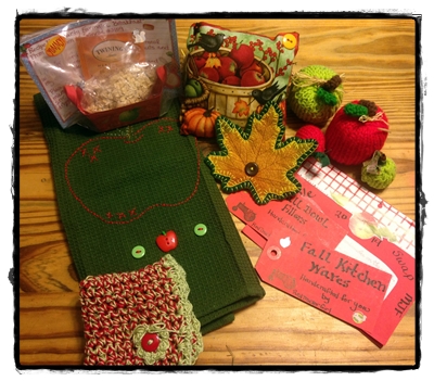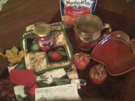 You have truly blessed me! Thank you for the wonderful box of Apple goodies. I LOVE the mug and cannot wait to have some Mulled Cider in it, the candy dish (or is it a spoon rest?) is so cute, I love the Salt & Pepper shakers-how did you know that I collect salt and pepper shakers? :), The towels and potholders are adorable and will be hanging up in the kitchen soon. The candle is too cute and smells so nice, the spatula-perfect timing because my husband stole mine for soap making!, the muffin mix will be put to use this morning with some french press coffee and the chilly morning, and the recipe sounds perfect, I love Apple Crisp but until now haven't had a tried and true recipe :) Thank you so much for making me smile and blessing me so much. I will post pictures later today.