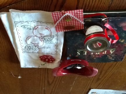 Thank You Jaimey for the wonderful apple pkg. I love the tatted apple bookmark, what beautiful work you do. The tea towel is just as pretty. I can't wait to taste your jam and can always use more apple recipes and an apple slicer is perfect when I make a pie. You really made my day with your wonderful pkg.