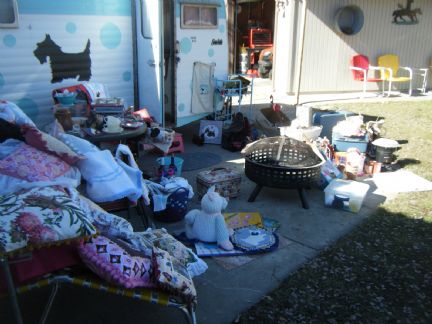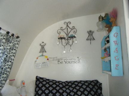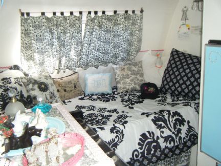 I have re-purposed a lot of things, like a cute sun dress w/beads, I cut the skirt half off and made the bed ruffle., I took out the trailer table and in it's place put a 1/2 size fold up table and covered it with an old lace curtain panel (Thrift shop find for $1.00) and for fun and whimsy I made a burlap deco pillow and then put just a few of the pink/blue kistschie stuff back in,,, Who say's I have to follow the rules of decorating! lol! It's been fun re-doing the trailer,,, and sort of like having a 'Barbie Doll'... I can change her outfit when ever I want! Happy Trails!