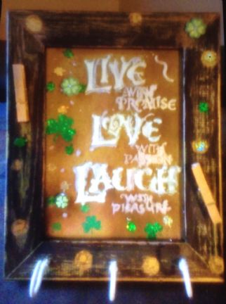 I have to start out apologizing to Michelle Ward - I received my mail art yesterday and spent all morning trying to upload a picture and have failed miserably. So I want to describe this neat solution to March's mail art. Michelle took a picture frame and on the inside backing scattered different sizes of shiny shamrocks. On the glass in beautiful printing she painted Live with Promise, Love with passion and Laugh with Pleasure. On the frame itself she added small clothespins and cup hooks across the bottom. Right now I have it right above my desk. So thanks again Michelle and if you took a picture before you sent it please post it. Becky |