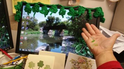 Dear Cheryl, I got your package a few days ago, and finally got to open and take a picture of everything. I love the clovers and will decorate my desk with them. The sea glass is lovely - although I live near the ocean I rarely get to it to look for sea glass.