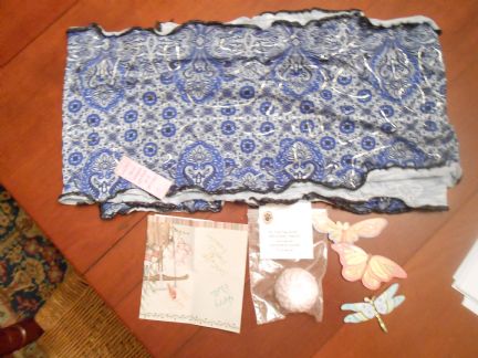 I got my mail art today from Tammy. Wow what a beautiful scarf, and other goodies. Love the butterflies. Thank you so much