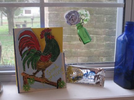 Becky, If I didn't know better I would tell everyone that you have known me for years! The mail art you made blends in so well with my window collections. The house we live in has been in my family for eight generations and is over 175 yrs old. I laughed at you telling me the little green bottle came from a gully. I have lots of bottles and jars that I have salvaged from gully's, so the bottle will feel right at home here. The rooster you painted looks a lot like a young rooster I have decided to keep that hatched last fall. Your painting looks like it could almost crow! Oh, lets not forget the candy!! I can see why it is one of your favorites. I did share a bite with my husband and he agrees that we need to order a box. Thank you so much for my window sill art. I will truly enjoy it.