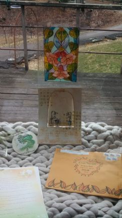Wow Marilou! My package arrived and it is a true work of ART! The three pieces are just lovely. The Spring tableaux of flowers sprouting in a window is very creative and a welcome treat to these gray Maine days. I have never heard of Iris Folding before but I am intrigued with the intricate clover ornament and the faux stained glass work is a m a z i n g -it's in my office window and it looks gorgeous! Thank-you so much-why, even the envelope is a work of art! Love, Aimee