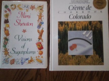 Cookbooks: ~Visions of Sugarplums by Mimi Sheraton. A collection of recipes from around the world that celebrate Christmas. Hardcover. ~Creme de Colorado: Cookbook from the Junior League of Denver, Hardcover