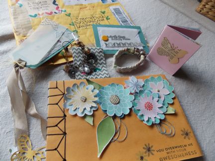 A special thank you to my Longview, Texas sister for the beautiful August Mail Art I received today! I believe it was Sherry, but there was no note or name as to who it was from, it may have fallen out, as the package was torn when it arrived. Love the journal and the bracelet! I love anything paper, journal, binder related and the decorations on the front were beautiful, I can't wait to start writing! And, the bracelet was perfect! I love the little wish flowers on it, reminds me of childhood memories of making wishes all summer long! Thank you for such a lovely surprise! ~ April