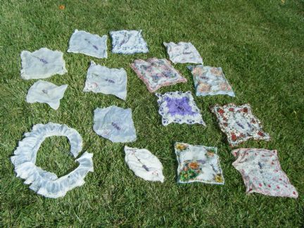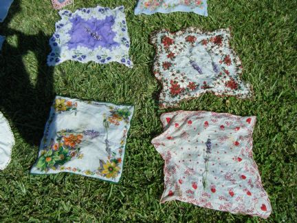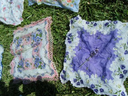 Oh My! as DH and I headed home today we spotted a yard sale and hubby asked if I wanted to snoop,,, Well YA!!!  Saw a few things but nothing I couldn't live with out,, when all of a sudden,, tucked under a bunch of other stuff I noticed a plastic box with ruffles... and to my joy I found it full of hankies... I asked the guy how much and he said "I'll give ya a $1 to take 'em".. I replied No, but I will buy them,,, so he said, "$1, final offer"... I said You betcha!  So as I got home, I washed them and now they are drying out on the lawn... I can hardly wait to iron them with a lavender water spritz.