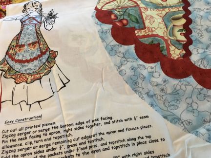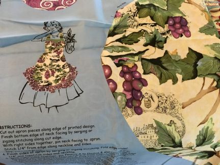 I have a total of 4 apron cutouts to sew. 3 of the first pattern the one with teapots and cherries. One of the second pattern with grapes and green leaves.