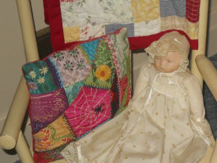 Darling vintage baby doll beside the gorgeous crazy quilt pillow! Hope your weekend was fall lovely!