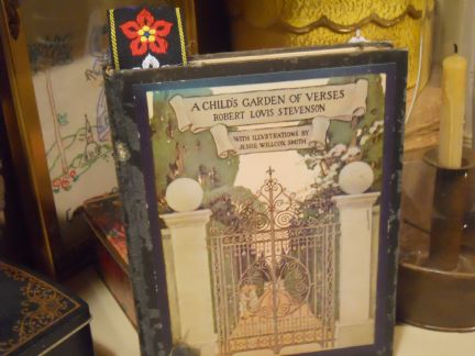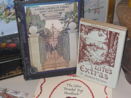 Thank you Deb for the wonderful presents you sent. Still don't know how you knew it was my Birthday. I love old books and 'A Child's Garden of Verses" by Robert Louis Stevenson, copyright 1905 is such a treasure.I don't know if the bookmark that is in the book is one Deb put in there, or if it was with the book, but is all hand stitched. Also included is a book on rag rugs and a small book of good thoughts. Then a nice little bag with extras. Thank you so much Deb. Nancy Jo