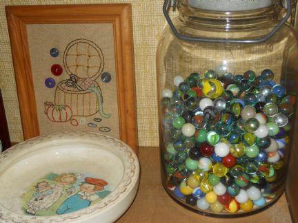 Oh Hi, Well I think I'm recovered from Thanksgiving. About 14 here small house, but we had lots of good food and fun. the kids brought me lots of nice Birthday presents. So all is good. Had snow, now it's rain, I think snow again tomorrow. Might put up the tree today. Anyway just a picture of another one of my mini collections. That Baby dish in the picture was My Aunt Glenda's when she was little, she is 103 now. And doing good. Anyway Marbles. Nancy Jo
