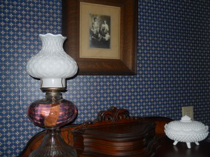 I have a lot of milk glass and oil lamps. Either passed down or from the thrift and garage sales. I was just pretty pleased with myself when I found this milk glass globe last summer and found that it fit perfect on this oil lamp. My Aunt who passed away several years ago had a lot of milk glass and it was given to me, so its here and there around the house. The picture above the dresser which has nothing to do with the title of this post is from 1900. The baby is my Aunt Glenda who is 104 now. The others are her Mom. her Grandma, her Great Grandma and her Great Grandpa. So they are also all past family too. Love the picture, Aunt Glenda gave it to me years ago.