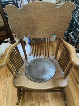 Look what I scored last weekend at our neighbors yard sale. We got to meet some neighbors and I scored an antique rocking chair. I collect Rocking Chairs and have for years, it started when I was pregnant with our 46 year old son. I was 10 months in and miserable, hubby bought me the rocking chair and took me to see Bambi! I of course still have the rocking chair and rocked Kent in many nights. And I love the movie Bambi too! So when I got out of the truck and went straight for the rocking chair and it had. $5.00 tag on it. I bought it, it is in perfect condition except for a couple upholstery nails on the seat to be replaced. I was so happy!