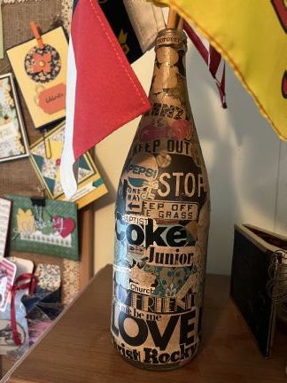 Nancy Jo I just love your craft space! Through the years I have tried to dabble in so many different crafty things, that my craft room is chaos, lol. I need to learn to simplify. This picture is where my love of crafting began. It was 1967, 4th grade, my teacher Mrs. Quilliams taught us about decoupage. We were to cut pics of our favorite words or things from newspapers and magazines and decorate a jar or bottle. Then bring to class for show-and-tell. I can’t believe I still have it. It used to be more colorful but is showing it’s age. Do you remember when these large Pepsi bottles came in a six pack and you returned them to the store to get a discount on the next six pack? Simpler times.
