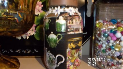 .jpg?v 1517585) I liked your decorated bottle from grade school, thought I would try it on a glass jar. I think you did better on your grade school one. It was fun to do, I wonder what the best glue to use would be on glass? What ever you used must have held pretty good.