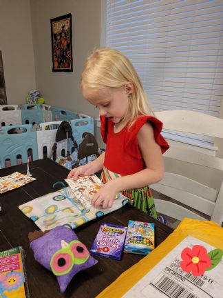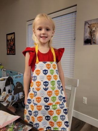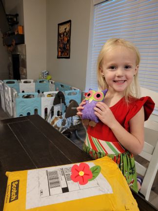 Thank you so very much Karen! You made Everleigh's day and she is over the moon with excitement. The package arrived while she was napping, so when she woke up she asked who it was for. I told her it was for her and she was so excited. The owl made her so excited and is now a baby that sleeps in her bed. The apron is absolutely adorable! And she loves all the new crafting supplies. She didn't waste any time getting started on her notebook. She has actually carried it around with her everywhere! We read the book last night before bed. It's a way cute book. She really enjoyed it. Thank you so much for the sweet package. You are so kind to think of her. Many hugs to you.