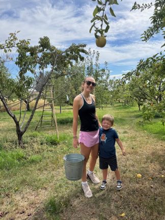 So far today for Apple Pie Sunday, we've only picked apples from a dozen different trees, sampling as we go. Of course, my grandson Tristan wanted to be on the ladder picking even though we didn't need a ladder. Our trees are so abundant this year and the tree branches so loaded, most of the fruit is within reach. I'm thinking we'll make a plum tort and an apple crisp. My granddaughter Mia loves pears, so she picked a bucket for just herself.
